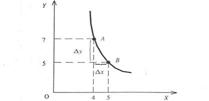 Рис. 3. Определение предельной нормы замены при переходе от набора А к набору В Переходя от А к В, потребитель сокращает потребление товара Y на Dy = -2 в обмен на увеличение товара X на Dx= 1ед., но общий уровень удовлетворения потребителя остается неизменным. Предельной нормой замены благом X блага Y (MRSXY – marginal rate of substitution) называется количество блага Y, которое должно быть сокращено при увеличении блага X на одну единицу так, чтобы уровень удовлетворения потребителя не изменился..
