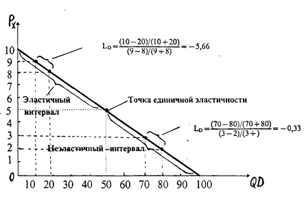 Рис.3 Эластичность в различных точках кривой спроса. ПРАВИЛО 1. Чем больше у товара заменителей (субститутов) и чем ближе их полезные свойства, тем выше эластичность спроса на этот товар. Классический пример самых неэластичных товаров—соль, которую невозможно ничем заменить. Величина спроса на нее не изменится при любой цене. А спрос на оливковое масло имеет тенденцию быть относительно эластичным, т. к. при повышении цены на него потребители переключатся на потребление подсолнечного, кукурузного и других растительных масел, пригодных для приготовления пищи. Другое дело—та категория потребителей, для которых нет альтернативы лечебным свойствам оливкового масла. В этом случае спрос будет относительно неэластичным. ПРАВИЛО 2. (следствие первого). Спрос на товар тем более эластичен, чем уже и конкретнее этот товар определен. Чем более агрегирован товар, тем ниже эластичность спроса. Агрегирование—это объединение товара с другими товарами во все более и более расширяющиеся группы. Рассмотрим перечень товаров: 1) эксклюзивная модель норковой шубы производства АО «МЕЛИТА» в выставочном зале Дома Моды; 2) шуба их меха норки производства АО «МЕЛИТА»; 3) шуба их меха норки; 4) шуба из натурального меха; 5) теплая одежда; 6) одежда. Степень агрегированности конкретного товара возрастает при движении от первого пункта к пятому. Например, исходя из наших климатических условий и культурных традиций, спрос на одежду вообще (наиболее агрегированный товар) будет абсолютно неэластичным. В условиях российских зим мы привыкли носить теплую одежду и не считаем, что другими удовлетворительными способами согреться в морозы, по крайней мере для абсолютного большинства людей, могут стать передвижение по улице только в автомобиле с обогревающимся салоном или постоянное употребление «горячительных» напитков. Автомобиль и напитки не подойдут на роль субститутов по отношению к теплой одежде. В то же самое время спрос на каждый конкретный вид теплой одежды относительно эластичен. Если вырастет цена на шубы из меха норки при неизменных ценах на кроличьи, то мы увидим, как многие будут щеголять в «субститутах» из кролика. Подорожают все натуральные меха, повысится спрос на шубы из синтетического «зайца». Проанализируйте, как будет постепенно повышаться эластичность от конца к началу вышеприведенного перечня товаров. ПРАВИЛО 3. (следствие первого). Спрос на товар одной фирмы обычно более эластичен, чем рыночный спрос на тот же самый товар, производимый во всей совокупности. Так, спрос на сигареты в целом менее эластичен, чем спрос на конкретный их сорт. Причина в том, что один сорт сигарет можно заменить на другой, при изменении цены одного из них. ПРАВИЛО 4. (следствие первого). Товары, расходы на которые имеют значительный удельный вес в бюджете потребителя, обладают более высокой эластичностью, чем товары, требующие незначительных бюджетных расходов. С этой точки зрения, 20% снижение цен на телевизоры окажет большее влияние на бюджет потребителя, чем такое же процентное понижение цены на зубные щетки. Спрос на телевизоры ощутимо возрастет, на зубные щетки—слабо. ПРАВИЛО 5. (следствие первого). Невысокую эластичность имеет обычно спрос на предметы первой необходимости, т. к. не располагают близкими знаменателями, тогда как спрос на предметы роскоши отли