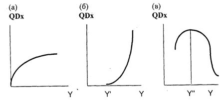 При построении кривых Энгеля, в отличие от кривых спроса и предложения, ценовой параметр откладываем по горизонтальной оси, а количество товара, на который предъявляется спрос—по вертикальной. Кривая на рис. 4 отображает зависимость величины спроса QD товара Х от дохода Y. Подобная кривая соответствует неэластичным нормальным товарам: приращения Y превосходят приращения QDx. Речь идет о товарах первой необходимости, потребление которых мало меняется в зависимости от уровня дохода потребителей. Кривая на рис. 4(6) характерна для эластичных (Ly>l) товаров. Такими товарами являются чаще всего предметы роскоши, недоступные для семей с доходами ниже Y'. Если доход достигает величины Y', то по мере роста Y приращения QDx значительно превосходят приращения Y, и кривая резко поднимается вверх. Кривая на рис. 4(в) описывает некачественные товары: до тех пор, пока доход не достигает величины Y", потребление таких товаров растет, а затем, по мере повышения достатка потребителей, QD подобных товаров сокращается. Знание эластичности отдельных товаров по доходу очень важно для прогнозирования потребительского спроса, поскольку при увеличении своего среднего дохода потребители предъявят спрос на большее количество эластичных по доходу товаров, чем на неэластичных и сократят потребление некачественных товаров. Если экономика переживает подъем и средние доходы потребителей возрастают, то отраслям, производящим товары с Ly>1 предстоит расширение, а отрасли с Ly<0 могут столкнуться с серьезными трудностями. Перекрестная эластичность спроса. Иногда важно знать, как меняется количество товара X1, на которое предъявляется спрос (например, рыба), при изменении цены другого товара Х2 (говядины). Такие экономические взаимоотношения могут быть выражены с помощью перекрестной эластичности спроса, определяемой следующим образом: L(Х1,Х2)= процентное изменение величины спроса QD на товар Х1 процентное изменение цены Рх на товар Х2 Формула средней точки для перекрестной эластичности спроса выглядит так же, как формула средней точки для эластичности спроса по цене, с той лишь разницей, что числитель в данном случае показывает процентное изменение величины спроса на один товар, а знаменатель—процентное изменение цены некоторого другого товара. Понятие перекрестной эластичности применимо либо для товаров-заменителей, либо для взаимодополняющих товаров. Для товаров-заменителей изменения Рх товара Х2 и QD товара X1, происходит в одном направлении: снижение цены товара Х2 вызывает снижение QD товара X1, а рост цены Х2 приводит к увеличению QD товара X1. Значит, для товаров-заменителей значения Lx1x2 всегда положительны и теоретически могут изменяться от 0 до +оо. У взаимодополняющих товаров изменения Рх товара Х2 и QD товара X1, происходит в обратных направлениях: увеличение Рх товара Х2 вызывает сокращение QD товара X1. Поэтому для товаров, дополняющих друг друга значение Lx1x2 всегда отрицательны и могут меняться от — оо до 0. В странах с развитой рыночной экономикой перекрестную эластичность используют при контроле за соблюдением антитрестовского законодательства: если какая-то фирма производит товар X1, имеющий заменитель—товар Х2, то монополизация этой фирмой отрасли приведет к тому, что снизится производство конкурирующего товара-заменителя Х2. В этой связи изменение цены то