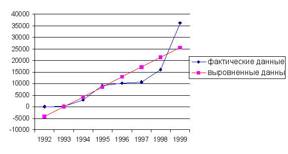 У По уравнению найдем расчетные значения выровненных уровней ряда динамики (последняя колонка в таблице 7). Графически результаты произведенного аналитического выравнивания ряда динамики страховой деятельности и фактические данные будут выглядеть следующим образом: Рис.1.