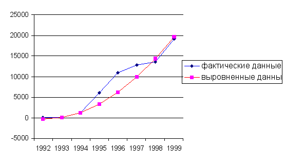 Как мы видим, выровненные данные действительно представляют собой параболу. Параметры уравнения параболы интерпретируются следующим образом: а0 - величина, выражающая средние условия образования уровней ряда, а1 - скорость развития данных ряда динамики, а2 - ускорение этого развития. |