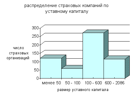 V = 433,47/451,12 *100% = 96% В этом случае средняя величина колеблемости размера уставного капитала страховых компаний по среднему линейному отклонению 363,65 тыс. руб., а по среднему квадратическому отклонению 433,47 тыс. руб. Величина среднего линейного, среднего квадратического отклонений и дисперсии также велики. Коэффициент вариации в данном случае равен 96%, то есть приблизительно в 1,5 раза больше, чем в предыдущем ряду. Коэффициент очень близок к 100%, тем самым, показывая очень высокую колеблемость. Поскольку величина коэффициента велика, можно сказать о том, что достаточно велик разброс значений признаков вокруг средней (как и видно на практике) и совокупность практически не однородна по своему составу. 2.1.1. Графическое изображение вариационного ряда. Графическое изображение статистических данных является неотъемлемой частью статистических наблюдений. Графики помогают наглядно представить закономерности, выявленные в процессе анализа статистических данных. Для графического изображения интервальных вариационных рядов применяется гистограмма. На рис.1. изображена гистограмма ряда распределения страховых компаний по размеру уставного капитала ( по данным таблицы 3). Рис. 1.
