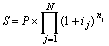 где N общее число периодов, в течение которых проценты начисляются по неизменной ставке. Подставив в это выражение условия нашего примера, получим: S = 2 * (1 + (60 / 360 * 0,3) + (30 / 360 * 0,35) + (30 /360 * 0,4)) = 2,225 млн. рублей Соответственно для сложных процентов, речь пойдет уже не о базисных, а о цепных темпах прироста, которые должны не складываться, а перемножаться: