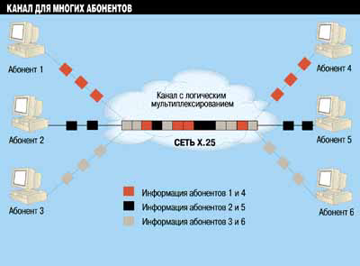 другой. Б между несколькими пользователями, во многих случаях оказывается экономически выгодней производить оплату за каждый байт переданной или полученной информации, а не оплачивать время применения телефонной линии при передаче данных по сети X.25. Особенно ощутимо такое преимущество в случае международных соединений. Рисунок 4. Мультиплексирование канала в сетях X.25. Метод разделения физического канала между абонентами в сетях X.25 называют еще мультиплексированием канала, точнее, "логическим" или "статистическим" мультиплексированием (Рис. 4). Термин "логическое мультиплексирование" вводится, чтобы отличить этот метод, например, от временного разделения канала. При временном разделении канала каждому из разделяющих его абонентов выделяется в каждую секунду строго определенное количество миллисекунд для передачи информации. При статистическом разделении канала нет строго регламентированной степени загрузки каждым из абонентов канала в данный момент времени. Эффективность использования статистического мультиплексирования зависит от статистических или вероятностных характеристик мультиплексируемого потока информации. Означает ли это, что вам, прежде чем подключаться к уже действующей сети X.25 или начинать создавать свою сеть, необходимо проводить детальный анализ вероятностных характеристик потоков информации, циркулирующих в вашей системе? Конечно, нет. Такие расчеты уже проведены. Накоплен большой опыт использования сетей X.25. Известно, что использование сети X.25 эффективно для широкого спектра задач передачи данных. Среди них и обмен сообщениями между пользователями, и обращение большого количества пользователей к удаленной базе данных, а также к удаленному хосту электронной почты, связь локальных сетей (при скоростях обмена не более 512 Кбит/с), объединение удаленных кассовых аппаратов и банкоматов. Иными словами, все приложения, в которых трафик в сети не является равномерным во времени. Какие еще преимущества дает сеть X.25? Может быть, одно из самых важных достоинств сетей, построенных на протоколах, описанных в рекомендации X.25, состоит в том, что они позволяют передавать данные по каналам телефонной сети общего пользования (выделенным и коммутируемым) оптимальным образом. Под "оптимальностью" имеется в виду достижение максимально возможных на указанных каналах скорости и достоверности передачи данных. Эффективный механизм оптимизации процесса передачи информации через сети X.25 - это механизм альтернативной маршрутизации. Возможность задания помимо основного маршрута альтернативных, т.е. резервных, имеется в оборудовании X.25, производимом практически всеми фирмами. Различные образцы оборудования отличаются алгоритмами перехода к альтернативному маршруту, а также допустимым количеством таких маршрутов. В некоторых типах оборудования, например, переход к альтернативному маршруту происходит только в случае полного отказа одного из звеньев основного маршрута. В других же переход от одного маршрута к другому происходит динамически в зависимости от загруженности маршрутов, и решение принимается на основании многопараметрической формулы (оборудование фирмы Motorola ISG, например). За счет альтернативной маршрутизации может быть значительно увеличена надежность работы сети, а это значит, что между люб