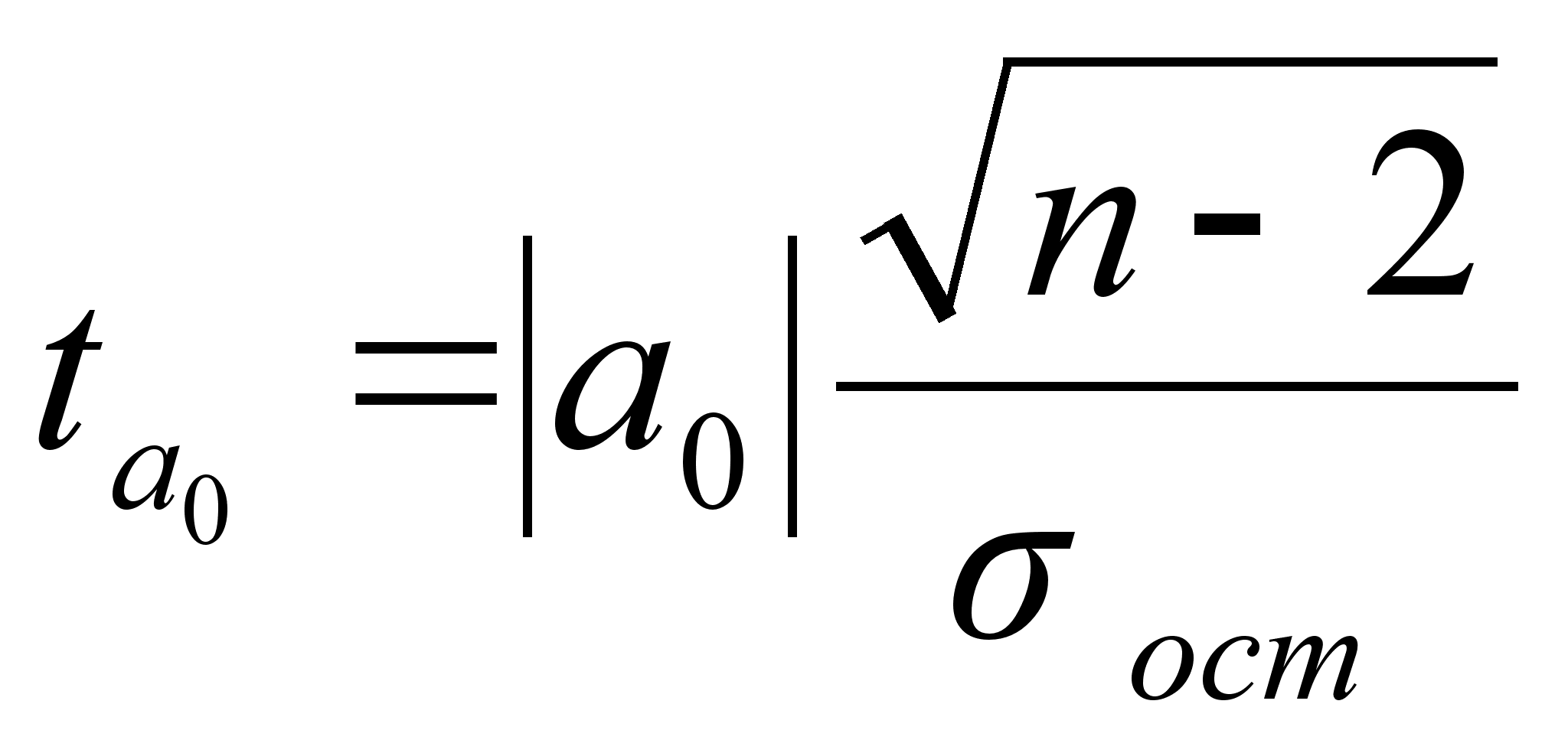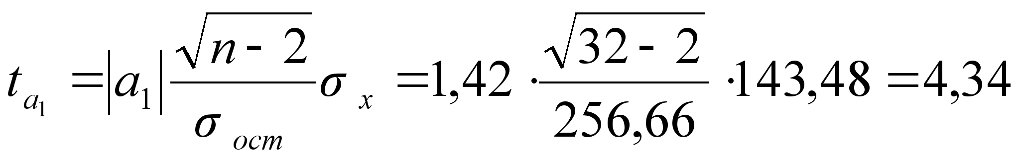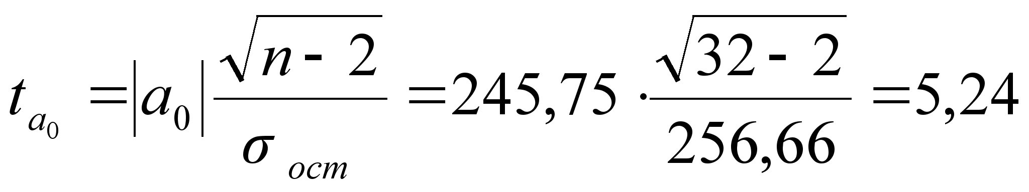 По таблице распределения Стьюдента я нахожу критическое значение t-критерия для ν= 32-2 = 30 . Вероятность α я принимаю 0,05. tтабл равно 2,042. Так как, оба значения ta0 и ta1 больше tтабл , то оба параметра а0 и а1 признаются значимыми и отклоняется гипотеза о том, что каждый из этих параметров в действительности равен 0 , и лишь в силу случайных обстоятельств оказался равным проверяемой величине. Проверка