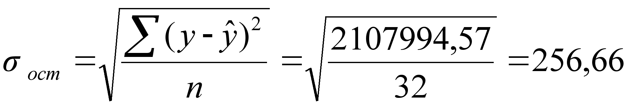 Это уравнение характеризует зависимость работающих активов от капитала банка. Расчётные значения ŷ , найденные по этому уравнению, приведены в таблице 1. Правильность расчёта параметров уравнения регрессии может быть проверена сравниванием сумм ∑у = ∑ŷ . В моем случае эти суммы равны. Но для того, чтобы применить мою формулу, надо рассчитать, насколько она приближенна к реальности, то есть проверить ее адекватность. Проверка адекватности регрессионной модели. Для практического использования моделей регрессии большое значение имеет их адекватность, т.е. соответствие фактическим статистическим данным. Корреляционный и регрессионный анализ обычно (особенно в условиях так называемого малого и среднего бизнеса) проводится для ограниченной по объёму совокупности. Поэтому показатели регрессии и корреляции – параметры уравнения регрессии, коэффициенты корреляции и детерминации могут быть искажены действием случайных факторов. Чтобы проверить, насколько эти показатели характерны для всей генеральной совокупности, не являются ли они результатом стечения случайных обстоятельств, необходимо проверить адекватность построенных статистических моделей. При численности объектов анализа до 30 единиц возникает необходимость проверки значимости (существенности) каждого коэффициента регрессии. При этом выясняют насколько вычисленные параметры характерны для отображения комплекса условий: не являются ли полученные значения параметров результатами действия случайных причин. Значимость коэффициентов простой линейной регрессии (применительно к совокупностям, у которых n д г - среднее квадратическое отклонение результативного признака от выравненных значений ŷ ;