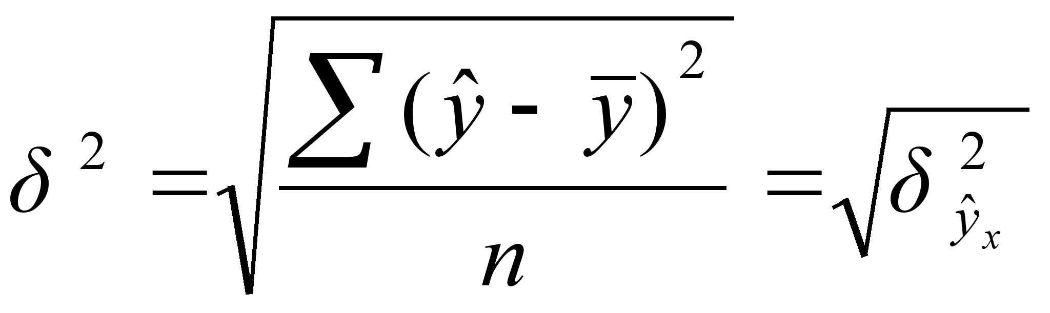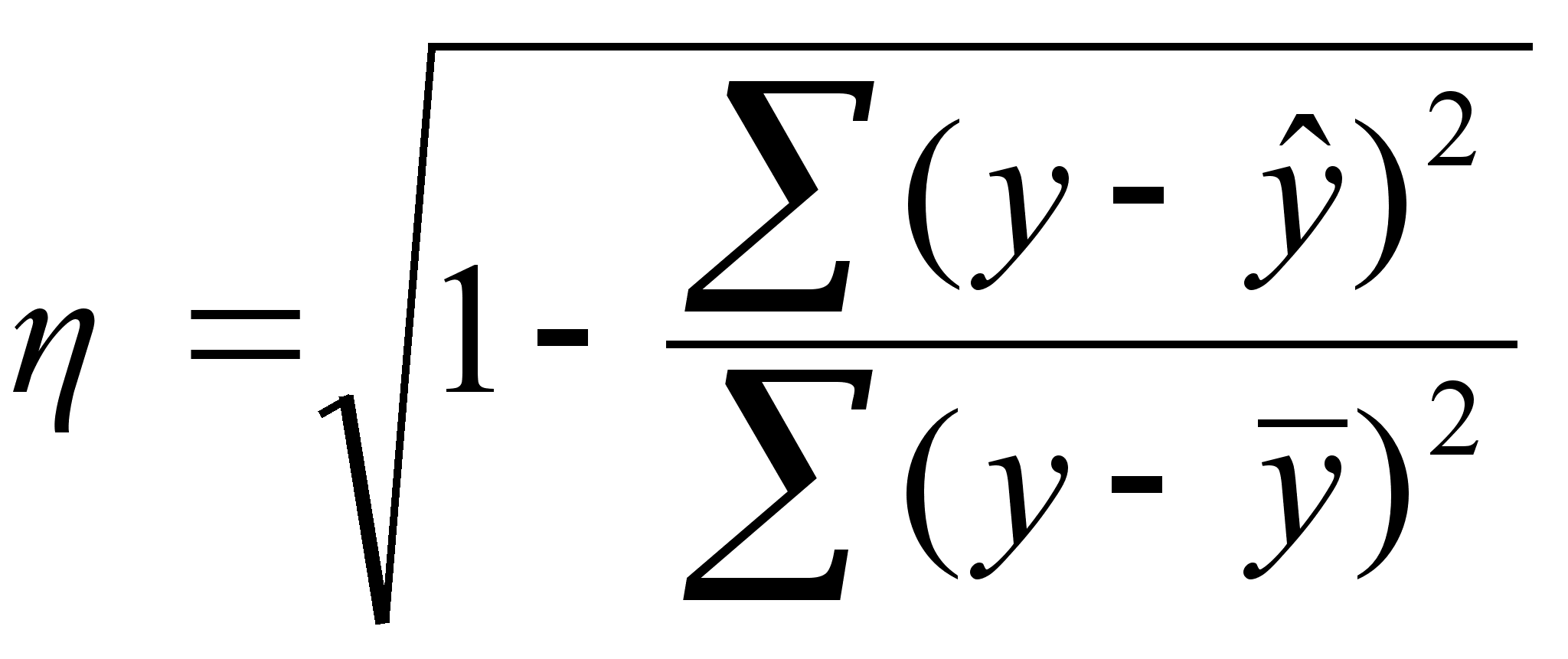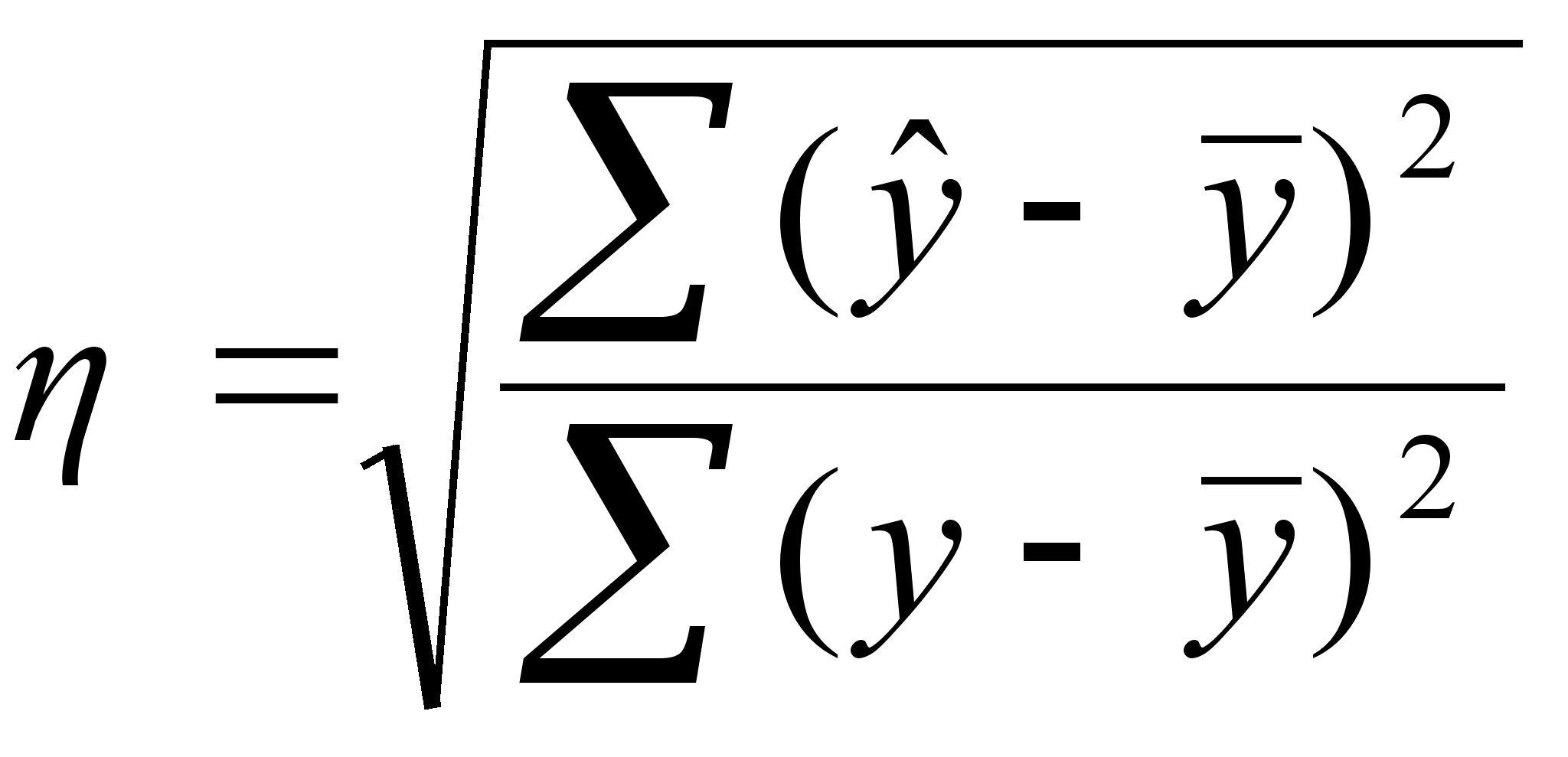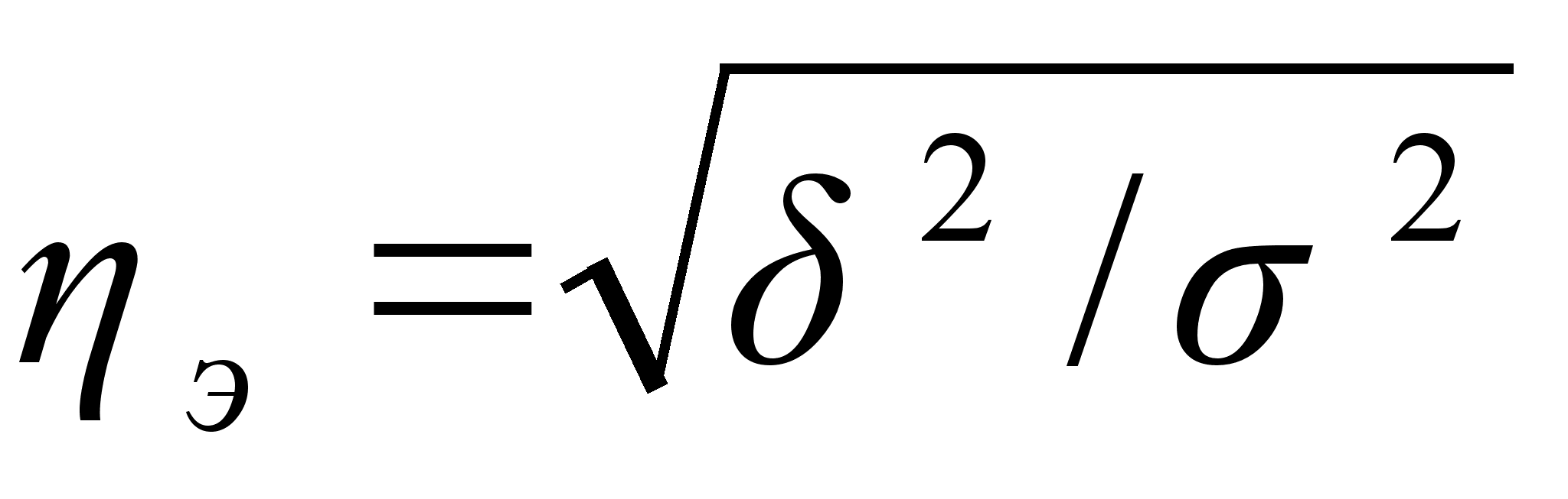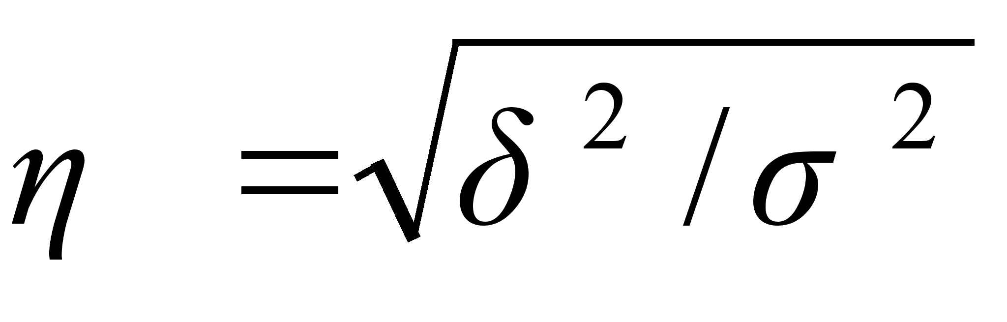 общей средней: Говоря о корреляционном отношении как о показателе измерения тесноты зависимости, следует отличать от эмпирического корреляционного отношения – теоретическое. Теоретическое корреляционное отношение η представляет собой относительную величину, получающуюся в результате сравнения среднего квадратического отклонения выравненных значений результативного признака δ, то есть рассчитанных по уравнению регрессии, со средним квадратическим отношением эмпирических (фактических) значений результативности признака σ: