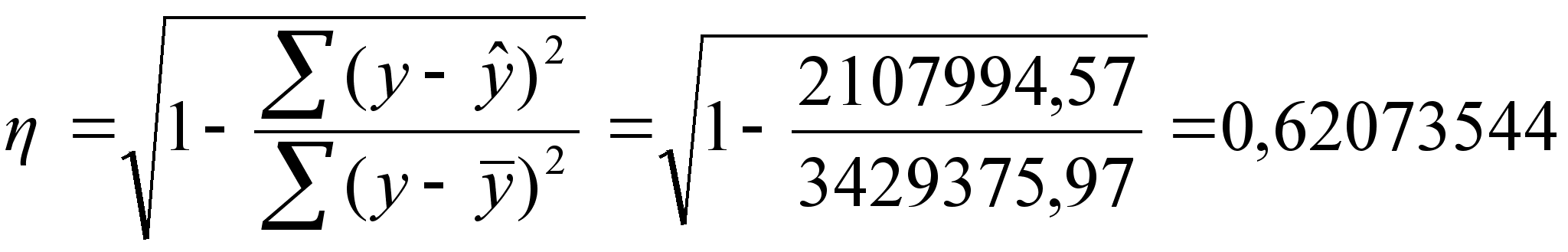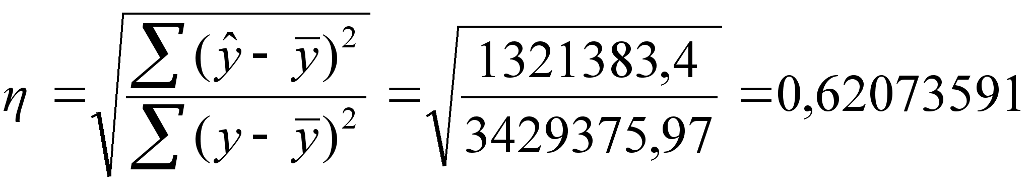 Подкоренное выражение корреляционного выражения представляет собой коэффициент детерминации (мера определенности, причинности). Коэффициент детерминации показывает долю вариации результативного признака под влиянием вариации признака-фактора. Теоретическое корреляционное выражение применяется для измерения тесноты связи при линейной и криволинейной зависимостях между результативным и факторным признаком. Как видно из вышеприведенных формул корреляционное отношение может находиться от 0 до 1. Чем ближе корреляционное отношение к 1, тем связь между признаками теснее. Теоретическое корреляционное отношение применительно к моему анализу я рассчитаю двумя способами: