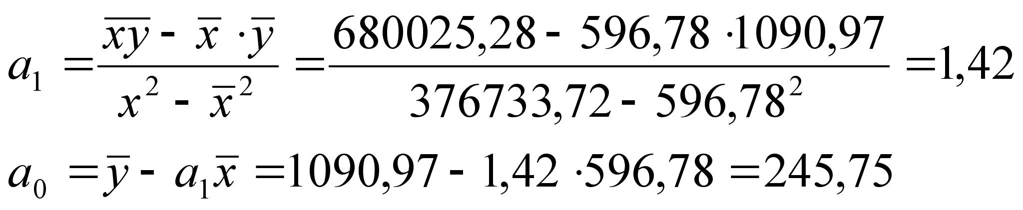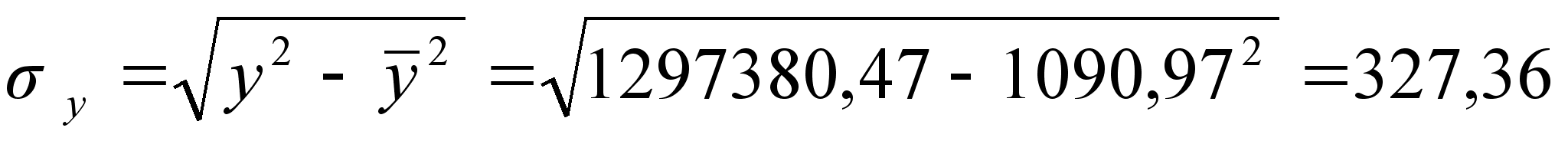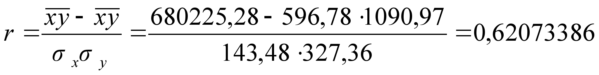 Значение линейного коэффициента корреляции важно для исследования социально-экономических явлений и процессов, распределение которых близко к нормальному. Он принимает значения в интервале: -1≤ r ≤ 1. Отрицательные значения указывают на обратную связь, положительные – на прямую. При r = 0 линейная связь отсутствует. Чем ближе коэффициент корреляции по абсолютной величине к единице, тем теснее связь между признаками. И, наконец, при r = ±1 – связь функциональная. Используя данные таблицы 1 я рассчитала линейный коэффициент корреляции r. Но чтобы использовать формулу для линейного коэффициента корреляции рассчитаем дисперсию результативного признака σy: