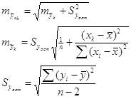 параметры a,b,c записываются в уравнение, затем подставляем полученное уравнение эмпирическое значение xi и находим теоретическое значение yi. Затем сравниваем yi теоретическое и yi эмпирическое. Сумма квадратов разности между ними должна быть минимальна. Выбираем тот вид зависимости при котором выполняется данная зависимость. В уравнении парной линейной регрессии: b – коэффициент парной линейной регрессии, он измеряет силу связи, т.е. характеризует среднее по совокупности отклонение у от его средней величины на принятую единицу измерения. b=20 при изменении х на 1 признак у отклониться от своего среднего значения на 20 в среднем по совокупности. Положительный знак при коэффициенте регрессии говорит о прямой связи между признаками, знак «-» говорит об обратной связи между признаками. §4. Применение парного линейного уравнения регрессии.Основное применение – прогнозирование по уравнению регрессии. Ограничением при прогнозировании служат условия стабильности других факторов и условий процесса. Если резко измениться в нем среда протекающего процесса, то данное уравнение регрессии не будет иметь места. Точечный прогноз получается подстановкой в уравнение регрессии ожидаемого значения фактора. Вероятность точной реализации такого прогноза крайне мала. Если точечный прогноз сопровождается значением средней ошибки прогноза, то такой прогноз называется интервальным. Средняя ошибка прогноза образуется из двух видов ошибок: 1. ошибок 1 рода – ошибка линии регрессии 2. ошибка 2 рода – ошибка связанная с ошибкой вариации. Средняя ошибка прогноза.