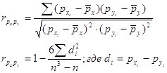 Ранги – порядковые номера единиц совокупности в ранжированном ряду. Ранжировать оба признака необходимо в одном и том же порядке от меньших к большим или наоборот. Если ранги единиц совокупности обозначить рх и ру, то коэффициент корреляции рангов примет следующий вид: