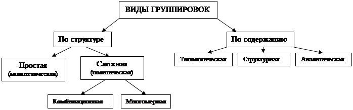 §3. Ошибки наблюденияОсновное требование, применяемое к статистическому наблюдению - это точность. Точность – степень соответствия какого-либо показателя признака определенным по материалам статистического наблюдения действительной величине. Расхождение между расчетным и действительным значением называется ошибкой наблюдения в зависимости от причин возникновения различают: ошибки регистрации и ошибки репрезентативности. Ошибки регистрации делятся на случайные и систематические. Случайные ошибки – результат действий случайных факторов (перепутаны строки, столбцы) Систематические ошибки – всегда имеют тенденцию либо к завышению либо к занижению показателя. (возраст) Ошибки репрезентативности – характер для не сплошного наблюдения и возникают в результате неточного воспроизведения выборной всей исходной совокупности. После получения статистических формуляров необходимо: 1. провести проверку полноты собранных данных. 2. провести арифметический контроль, основанный на связи различных признаков между собой. 3. провести логический контроль основанный на знании логических связей между признаками. §4. Сводка и группировкаНа основе собранных данных нельзя произвести расчет и сделать выводы, для начала их нужно обобщить и свести в единую таблицу. Для этих целей служат сводка и группировка. Сводка – комплекс последовательных операций по обобщению конкретных единичных фактов, образующих совокупность и выявление типичных черт и закономерностей присущих изучаемому явлению в целом. Простая водка – подсчет общих итогов по совокупности. Сложная сводка – комплекс операций по группировке единичных наблюдений, подсчет итогов по каждой группе и по всему объекту в целом и представлении результатов в виде статистических таблиц. По форме обработки материала сводка бывает децентрализованная , централизованная – такая сводка проводится при единовременном статистическом наблюдении. Группировка – расчленение множества единиц изучаемой совокупности на группы по определенным признакам. §5. Виды статистических группировокГруппировки могут быть классифицированы по структуре и по содержанию.