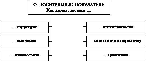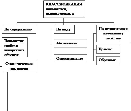 · Средние величины · Показатели вариации · Показатели связи признаков · Показатели структуры и характера распределения · Показатели динамики · Показатели колебимости · Показатели точности и надежности выборочных оценок · Показатели точности и надежности прогнозов По виду: суммарное количество единиц либо суммарное свойство объекта. Это сумма первичных признаков, измеряется в шт., кг, м, $, и т.д. Относительный показатель – получаемый путем сопоставления абсолютных или относительных показателей в пространстве, во времени или в сравнении показателей разных свойств изучаемого объекта. Относительный показатель 1го порядка получается путем сопоставления 2х абсолютных показателей. Относительный показатель 2го порядка получается путем сопоставления относительных показателей 1го порядка и т.д. Относительный показатель 3го порядка и выше встречаются очень редко. Прямые показатели – такие показатели величина которых увеличивается с увеличением исследуемого явления . Обратные показатели – показатели величина которых уменьшается с увеличением исследуемого явления.