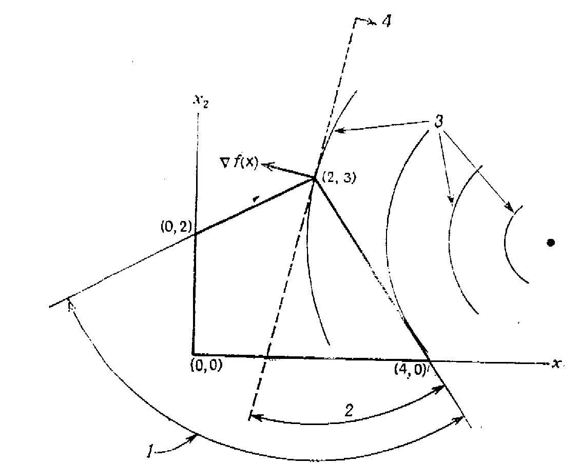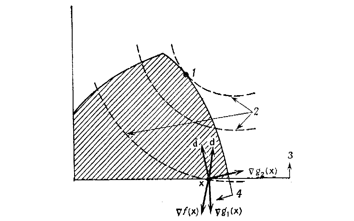 И Рис. 9. Использование почти активных ограничений. 1 — оптимальное решение; 2— линии уровня целевой функции; 3—1-е ограничение; 4— 2-е ограничение. Использование почти активных ограничений Напомним задачу определения направления как для случая линейных, так и нелинейных ограничений-неравенств. Если заданная точка близка к границе, определяемой одним из ограничений, и если это ограничение не используется в процессе нахождения направления движения, то может случиться так, что удастся сделать только маленький шаг и мы окажемся на границе, определяемой этим ограничением. На рис. 9 в точке х активным является только первое ограничение. Однако точка х близка к границе, определяемой вторым ограничением. Если множество I в задаче определения направления задать в виде I= {1}, то оптимальным будет направление d и до выхода на границу допустимой области можно сделать только маленький шаг. Если же в множество активных ограничений включить оба ограничения, т. е. положить I={1, 2), то решение задачи Р определения направления даст вектор и, который обеспечивает большие возможности для движения в рамках допустимой области. Таким образом, это наводит на мысль о том, что в качестве множества I следует брать совокупность индексов почти активных ограничений. Точнее, вместо множества {i: gi(х)=0} в качестве I следует брать множество {i, gi(х)+е0}, где е>0—достаточно малое число. Метод возможных направлений не обязательно сходится к точке Ф. Джона. Это следует из того, что соответствующее алгоритмическое отображение незамкнуто. При более формальном использовании введённого здесь понятия почти активного ограничения можно установить замкнутость алгоритмического отображения и, следовательно, сходимость общего алгоритма. Список литературы: