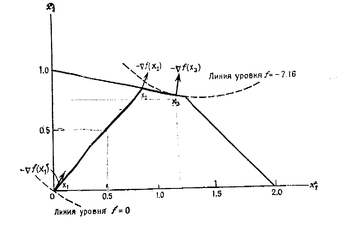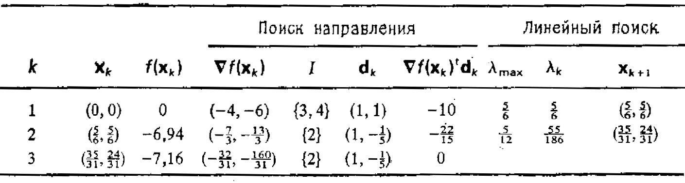 Рис 4. Итерация 3 Поиск направления. В точке х3= имеем Кроме того, множество активных ограничений в точке хз равно l = {2}, так что направление движения получается из решения следующей задачи: Можно легко проверить по рис. 4. что действительно является решением этой задачи линейного программирования. Соответствующее значение целевой функции равно нулю, и процедура заканчивается. Более того, точка является точкой Куна—Таккера. В этой конкретной задаче функция f выпукла, и по теореме 4.3.7 точка х является оптимальным решением. Таблица 1