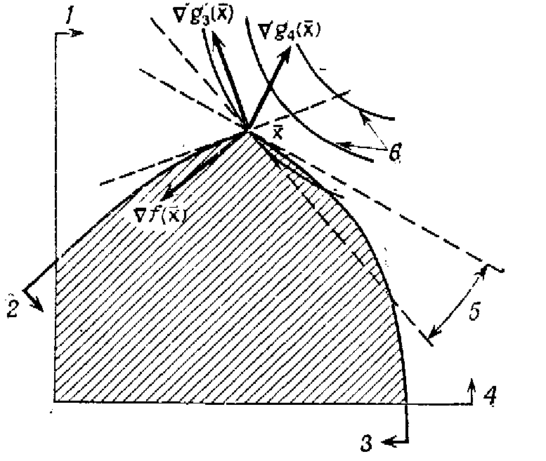 Рис. 6. Совокупность возможных направлений спуска в задаче с нелинейными ограничениями. 1— 1-е ограничение; 2—3-е ограничение; 3—4-е ограничение; 4— 2-е ограничение; 5— возможные направления спуска; 6— линии уровня целевой функции. Доказательство. Пусть вектор и удовлетворяет неравенствам и при . Для выполняются неравенства , и так как gi непрерывны в точке х, то для достаточно малых . В силу дифференцируемости функций gi при имеем где при . Так как , то при достаточно малых . Следовательно, при i = 1, . . .,m, т.е. точка допустимая для достаточно малых положительных значений . Аналогично из следует, что для достаточно малых > 0 имеем . Следовательно, вектор и является возможным направлением спуска. На рис. 6 показана совокупность возможных направлений спуска в точке х. Вектор d, удовлетворяющий равенству , является касательным к множеству в точке х. Поскольку функции gi нелинейны, движение вдоль такого вектора d может привести в недопустимую точку, что вынуждает нас требовать выполнения строгого неравенства .