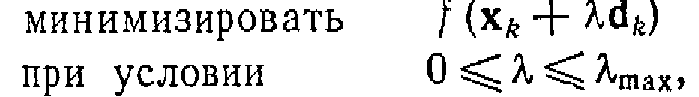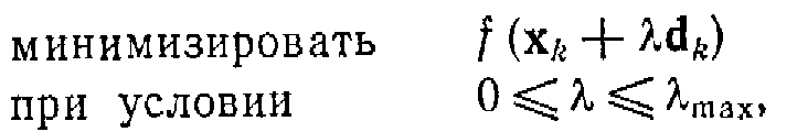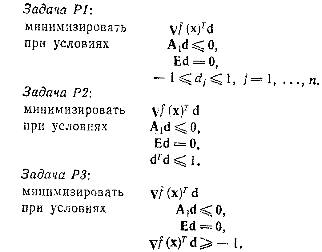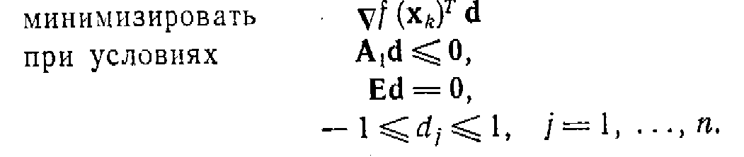 в Задачи Р1 и РЗ являются задачами линейного программирования и, следовательно, могут быть решены симплекс-методом. Задача Р2 содержит квадратичное ограничение, но может быть рассмотрена в несколько упрощенном виде. Так как d = 0 является допустимой точкой в каждой из приведенных выше задач и так как значение целевой функции в этой точке равно нулю, то ее оптимальное значение в задачах Р1, Р2 и РЗ не может быть положительным. Если минимальное значение целевой функции в задачах Р1, Р2 или РЗ отрицательно, то по лемме построено возможное направление спуска. С другой стороны, если минимальное значение целевой функции равно нулю, то, как показано ниже, х является точкой Куна — Таккера. ЛЕММА. Рассмотрим задачу минимизации f(х) при условиях Ахb и Ех=е. Пусть х — допустимая точка, для которой А1x=b и А2x2, где АT=(А1T, А2T), а bT=(b1T, b2T). Тогда х является точкой Куна—Таккера в том и только в том случае, если оптимальное значение целевой функции в задачах Р1, Р2 или РЗ равно нулю. Доказательство. Вектор х является точкой Куна—Таккера тогда и только тогда, когда существуют векторы u0 и v, такие, что . По следствию 2 из теоремы эта система разрешима в том и только в том случае, если система не имеет решений, т. е. тогда и только тогда, когда оптимальное значение в задачаx Р1, Р2 или РЗ равно нулю. Линейный поискТолько что было показано, как строить возможное направление спуска или убедиться, что текущая точка удовлетворяет условиям Куна—Таккера. Пусть теперь хk —текущая точка, а dk-возможное направление спуска. В качестве следующей точки xk+1 берется , где длина шага К& определяется из решения следующей задачи одномерной минимизации: Минимизировать при условиях Предположим теперь, что АT=(А1T, А2T), а bT=(b1T, b2T), так что и . Тогда задачу одномерной минимизации можно упростить следующим образом. Во-первых, заметим, что Ехk=е и Еdk=0, так что ограничение излишне. Так как и для всех 0. Таким образом, рассматриваемая задача приводится к следующей задаче линейного поиска;