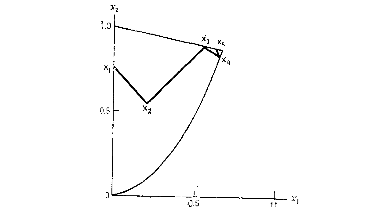 Оптимальным решением этой задачи является вектор d4 = (-0.5171, 1.0000)T и z4=— 2.340. Линейный поиск. Максимальное значение К, для которого точка х4 +d4 допустима, равно mах= 0.0343. При этом ограничение становится активным. Значение 4 получается минимизацией f(x4+ d4) == 3,5692— 2.340 —6.4681 при условии и равно 4= 0.0343. Следовательно, новой точкой является x5==x4 + 4d4 = (0.6302, 0.8740)T. Значение целевой функции в этой точке равно -6.5443, т. е. сравняю со значением —6.5590 в оптимальной точке (0.658872, 0.808226)T . В табл. 2 приведены результаты вычислений на первых четырех итерациях метода. На рис. 7 показан процесс поиска оптимума.