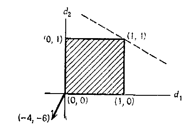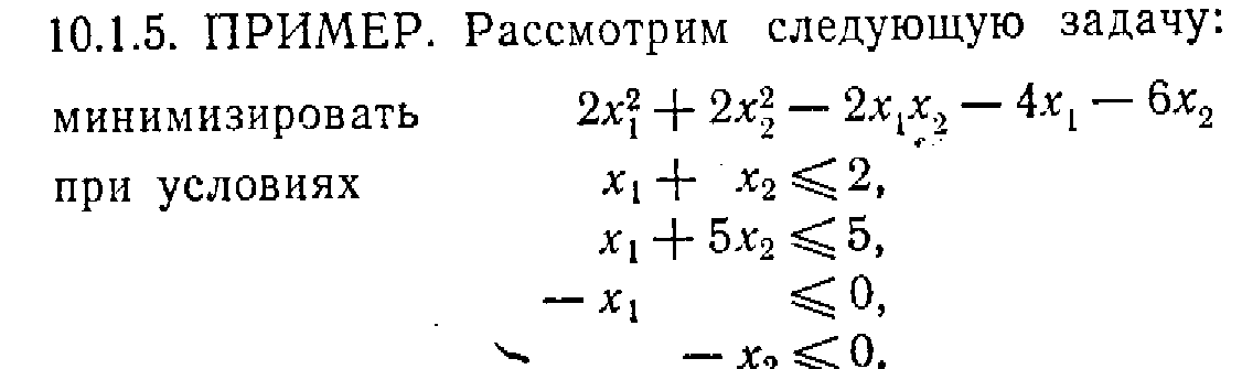 П Рис. 2Эту задачу можно решить симплекс методом для решения задач линейного программирования. На рисунке 2 показана допустимая область этой задачи. Линейный поиск. Теперь, двигаясь из точки (0, 0) вдоль направления (1, 1), нужно найти точку, в которой значение целевой функции минимально. Любая точка может быть записана в виде , а целевая функция в этой точке принимает вид . Максимальное значение коэффициента , для которого точка допустима, вычисляется по формулам и равно Следовательно, если —новая точка, то значение получается из решения следующей задачи одномерной минимизации: минимизировать —10+2 при условии 0 . Очевидно, что решением является , так что Итерация 2