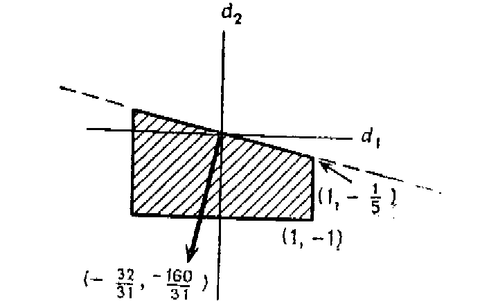 П Рис 3. Кроме того, множество активных ограничений в точке х2 равно l={2}, так что направление движения получается из решения следующей задачи: минимизировать при условии Читатель может проверить на рис. 3, что оптимальным решением этой задачи линейного программирования является точка , а соответствующее значение целевой функции равно . Линейный поиск. При начальной точке х2 любая точка в направлении d2 может быть представлена в виде Соответствующее ей значение целевой функции равно Максимальное значение для которого точка Х2+d2 остается допустимой, определяется в соответствия с (1) следующим образом: Таким образом, в качестве ^ берется оптимальное решение следующей задачи: минимизировать при условии Оптимальным решением этой задачи является , так что