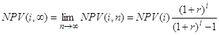 где NPV (i) - чистый приведенный доход исходного проекта; i- продолжительность этого проекта; r - коэффициент дисконтирования в долях единицы; N - наименьшее общее кратное; n - число повторений исходного проекта (оно характеризует число слагаемых в скобках). В каждой из двух приведенных ниже ситуаций требуется выбрать наиболее предпочтительный проект (в млн руб.), если цена капитала составляет 10%: а) проект А: -100, 50, 70; проект В: -100, 30, 40, 60; б) проект С: -100, 50, 72; проект В: -100, 30, 40, 60. Если рассчитать NPV для проектов А, В и С, то они составят соответственно: 3,30 млн руб., 5,4 млн руб., 4,96 млн руб. Непосредственному сравнению эти данные не поддаются, поэтому необходимо рассчитать NPV приведенных потоков. В обоих вариантах наименьшее общее кратное равно 6. В течение этого периода проекты А и С могут быть повторены трижды, а проект В - дважды. В случае трехкратного повторения проекта А суммарный NPV равен 8,28 млн руб.: NPV = 3,30 + 3,30 / (1+0,1)2+3,30 / (1+0,1)4 = 3,30 + 2,73 +2,25 = 8,28, где 3,30 - приведенный доход 1-ой реализации проекта А; 2,73 - приведенный доход 2-ой реализации проекта А; 2,25 - приведенный доход 3-ей реализации проекта А. Поскольку суммарный NPV в случае двукратной реализации проекта В больше (9,46 млн руб.), проект В является предпочтительным. Если сделать аналогичные расчеты для варианта (б), получим, что суммарный NPV в случае трехкратного повторения проекта С составит 12,45 млн руб. (4,96 + 4,10 + 3,39). Таким образом, в этом варианте предпочтительным является проект С. Метод бесконечного цепного повтора сравниваемых проектов Рассмотренную выше методику можно упростить в вычислительном плане. Так, если анализируется несколько проектов, существенно различающихся по продолжительности реализации, расчеты могут быть достаточно сложными. Их можно упростить, если предположить, что каждый из анализируемых проектов может быть реализован неограниченное число раз. В этом случае n®¥ число слагаемых в формуле расчета NPV(i, n) будет стремиться к бесконечности, а значение NPV(i, ¥) может быть найдено по формуле для бесконечно убывающей геометрической прогрессии: