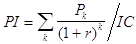 где i — прогнозируемый средний уровень инфляции. Расчет с помощью приведенных формул вручную достаточно трудоемок, поэтому для удобства применения этого и других методов, основанных на дисконтированных оценках, разработаны специальные статистические таблицы, в которых табулированы значения сложных процентов, дисконтирующих множителей, дисконтированного значения денежной единицы и т. п. в зависимости от временного интервала и значения коэффициента дисконтирования. Необходимо отметить, что показатель NPV отражает прогнозную оценку изменения экономического потенциала предприятия в случае принятия рассматриваемого проекта. Этот показатель аддитивен во временном аспекте, т. е. NPV различных проектов можно суммировать. Это очень важное свойство, выделяющее этот критерий из всех остальных и позволяющее использовать его в качестве основного при анализе оптимальности инвестиционного портфеля. Пример 1. Требуется проанализировать инвестиционный проект со следующими характеристиками (млн. руб.): - 150, 30, 70, 70, 45. Рассмотрим два случая: а) цена капитала 12%; б) ожидается, что цена капитала будет меняться по годам следующим образом: 12%, 13%, 14%, 14%. В случае а) воспользуемся формулой (1): NPV = 11,0 млн руб., т.е. проект является приемлемым. б) Здесь NPV находится прямым подсчетом: NPV=-150+30/1,12+70/(1,12*1,13)+70/(1,12*1,13*1,14)+30/(1,12*1,13*1,14*1,14) = -1,2 т.е. проект убыточен. Область применения и трудности NPV-метода. При помощи NPV-метода можно определить не только коммерческую эффективность проекта, но и рассчитать ряд дополнительных показателей. Столь обширная область применения и относительная простота расчетов обеспечили NPV-методу широкое распространение, и в настоящее время он является одним из стандартных методов расчета эффективности инвестиций, рекомендованных к применению ООН и Всемирным банком. Однако корректное использование NPV-метода возможно только при соблюдении ряда условий: Объем денежных потоков в рамках инвестиционного проекта должен быть оценен для всего планового периода и привязан к определенным временным интервалам. Денежные потоки в рамках инвестиционного проекта должны рассматриваться изолированно от остальной производственной деятельности предприятия, т.е. характеризовать только платежи и поступления, непосредственно связанные с реализацией данного проекта. Принцип дисконтирования, применяемый при расчете чистого приведенного дохода, с экономической точки зрения подразумевает возможность неограниченного привлечения и вложения финансовых средств по ставке дисконта. Использование метода для сравнения эффективности нескольких проектов предполагает использование единой для всех проектов ставки дисконта и единого временного интервала (определяемого, как правило, как наибольший срок реализации из имеющихся). При расчете NPV, как правило, используется постоянная ставка дисконтирования, однако в зависимости от обстоятельств (например, ожидается изменение уровня процентных ставок) ставка дисконтирования может дифференцироваться по годам. Если в ходе расчетов применяются различные ставки дисконтирования, то, во-первых, формулы (1) и (2) неприменимы и, во-вторых, проект, приемлемый при постоянной ставке дисконтирования, может стать неприемлемым. 3.2. Индекс рентабельности инвестиций.(PI) Этот метод является по сути следствием метода чистой те