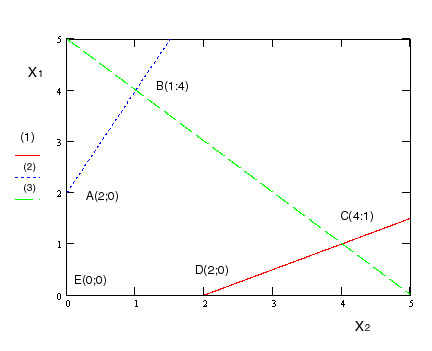 Как видно из иллюстрации многогранник ABCDE образует область допустимых решений. Если область допустимых решений не является замкнутой, то либо max(f)=+ ∞, либо min(f)= -∞.
