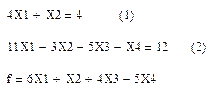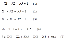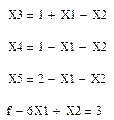 Система (4) – естественные ограничения и в таблицу не вписываются. Уравнения (1), (2), (3) образуют область допустимых решений. Выражение (5) – целевая функция. Свободные члены в системе ограничений и области допустимых решений должны быть неотрицательны. В данном примере X3, X4, X5 – базисные неизвестные. Их надо выразить через свободные неизвестные и произвести их замену в целевой функции.