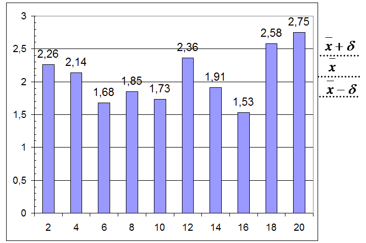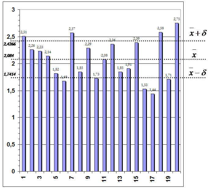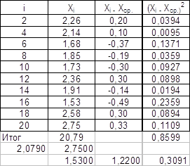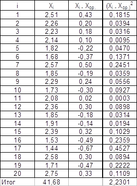 Вывод: С уменьшением количества измерений границы доверительного интервала раздвигаются (для истинного значения случайной величины). 5. Исключение результатов, содержащие грубые погрешности. Выборку из 20-ти измерений проверить на наличие результатов с погрешностями методом « X20=2,084 Xmax = 2,75