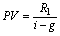 То есть современная величина конечной ренты, имеющей срок n периодов, может быть представлена как разница между современными величинами двух вечных рент, выплаты по одной из которых начинаются с первого периода, а по второй – с периода (n+1). В случае, если член вечной ренты R ежегодно увеличивается с постоянным темпом прироста g, то приведенная стоимость такой ренты определяется по формуле: