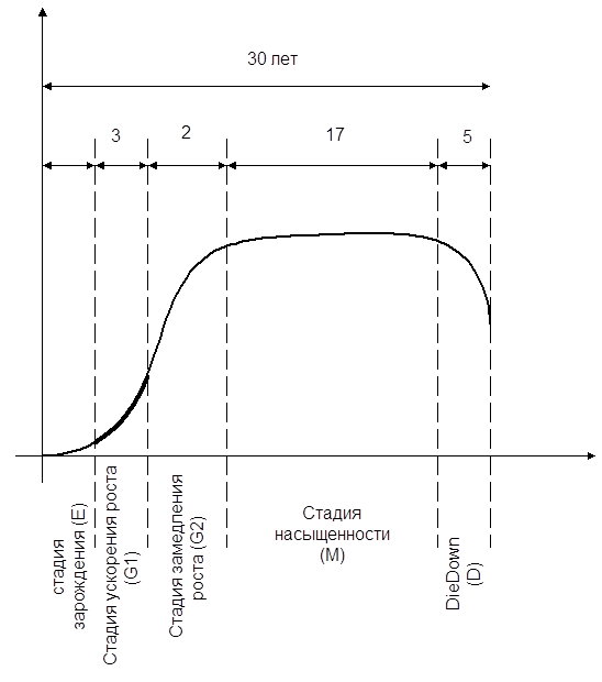 Услуга предоставления телефонного сервиса посредством IP-телефонии находится на стадии ускоряющегося роста. Кривая жизненного цикла услуги имеет традиционный характер, то есть спрос не зависит от времени года или от влияний моды. Жизненный цикл этой услуги предположительно составит порядка 30 лет. При чем стадия зрелости наступит примерно через 2 года. Кривая жизненного цикла услуги имеет следующий вид: