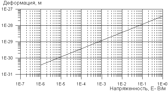 где ρ = 8,61642·10–11 [К·кг–1] – электрический заряд на один килограмм массы; Eσ = 0,7744 [А–1м3с–2] – параметр вакуума, который может быть определён как удельная поверхностная электрическая напряжённость; S = 6,255854·1043 [К·м–4] – поверхностная плотность заряда, приходящаяся на единицу направления. Далее мы вступаем в зону незнания. Какие напряжённости управляют процессами мышления? Образами? Двигательной деятельностью? На эти вопросы могут ответить только биологи, которые исследуют электрические процессы в живых организмах. В данном случае автор выступает только как физик. Можно, например, предположить, что мыслительные напряжённости обладают величинами порядка микровольт, а максимум – около одного вольта. Рассчитаем график деформации структуры вакуума в зависимости от электрической напряжённости, воспользовавшись формулой (1). На рис. 1 дан график расчёта. Напомним, что при земной гравитации деформация примерно на 5 порядков больше максимальной величины на нашем графике и составляет 1,27·10–22 м, для Солнца 6,7·10–22 м. Для того, чтобы поднять какой-либо предмет, пусть даже очень легкий, необходимо в 100 000 раз сильнее «подумать» – создать мысль с такой напряжённостью. Чтобы сдвинуть лёгкую бумажку с малым весом и соответственно с малым трением (по гладкой поверхности опоры), потребуются во много раз меньшие напряжения и мысленные усилия.