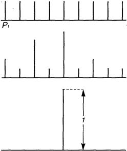 Смысл условия нормировки заключается в том, что сумма вероятностей выпадения всех 6-ти граней игральной кости равна вероятности выпадения любой грани, т.е. : Р1 + Р2 + … Р6 = 1/6 + 1/6 + … + 1/6 = 1 6 раз В рассматриваемом нами процессе обучения, приводящем к дифференцировке значений вероятностей реакций Pi , составляющих полную группу N, условие (3.8) свидетельствует о том, что увеличение вероятностей каких -то реакций может происходить только за счет уменьшения всех остальных вероятностей (чтобы сумма была по-прежнему равна 1, см. рис. 1, случай б). В предельном случае одна из N вероятностей может возрасти до 1, тогда все остальные вероятности станут равны 0 (рис. 1). В случае текста предельному случаю дифференцировки соответствует вероятность одной буквы (например, «е»), равная 1. Вероятности всех остальных букв при этом равна нулю. Это значит, что текст вырождается в повторение одной буквы е е е е е ... Этот случай соответствует жесткой детерминации (незатухающий строго периодический процесс). Соответствующее жесткой детерминации распределение вероятностей, при котором некая вероятность Рк равна 1, а все остальные - равны 0, в общем виде запишется как Рк=1 (3.9) Р1 = Р2 = . . .= Рк-1 = Рк+1=. . .= 0 (3.10)
