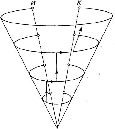 Все стадии перехода от состояния максимальной энтропии, описываемого условиями (3.4), (3.5), (3.6), к состоянию жесткой детерминации, которому соответствуют условия ( 3.9 ) + (3.13) можно представить в виде дуги, соединяющей исходное состояние Н с конечным состоянием К (рис. 2).