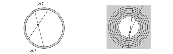 Рис. 11. Независимость сил тяготения от радиуса полости Следует доказать, что силы тяготения не изменятся при изъятии вещества, окружающего полость в форме оболочки, подобной и подобно расположенной. Действительно, сравним величину и положение асимметрично расположенных масс до и после изъятия оболочки. Асимметрично расположенное вещество в обоих случаях показано красным цветом. Изъятое в виде оболочки вещество – синим. Обратим внимание на следующее обстоятельство. По условию положение пробной массы относительно центра полости в обоих случаях не меняется, следовательно, толщина асимметрично расположенного вещества остается постоянной. А площадь возрастает пропорционально квадрату расстояния. Отсюда, удаление центра масс, асимметрично расположенного вещества, точно компенсируется увеличением его массы. Правда, приведенное доказательство – просто по иному изложенная «Теорема Ньютона», но из опыта изложения автор знает, что неизменность сил тяготения от радиуса полости вызывает некоторое недоверие у части читателей, поэтому автор счел необходимым остановиться на данном факте отдельно. Вывод из проведенного анализа следующий: применять обобщение, предложенное Э. Милном и В. Мак-Кри, не корректно, как противоречащее общим законам физики. Данный вывод согласуется и с законами математического анализа. Согласно аксиоматике геометрии Евклида, распространение отрезка на прямую линию невозможно. Поскольку это противоречило бы аксиоме «порядка», согласно которой, при откладывании отрезка на прямой линии, прямая обязательно сохранит хотя бы одну внешнюю точку по отношению к концам отрезка. Что, конечно, противоречило бы условию отображения отрезка на всю прямую. Отсюда распространение бесконечной последовательности сферически-симметричных оболочек на все пространство невозможно. Распространение бесконечной последовательности отрезков на прямую линию незаконно также и по причине нарушения аксиомы «счетности», поскольку любое количество отрезков может быть объединено в один отрезок, длина которого всегда может быть выражена через начальный отрезок, взятый за масштаб. Что привело бы к счетности длины прямой линии. Некорректность данной процедуры очевидна. Указанная операция – распространение бесконечной последовательности оболочек на все пространство – также противоречила бы и свойству аффинности, согласно которому отрезок отображается только на отрезок, а прямая – на прямую. Отображение отрезка на прямую линию не аффинное по определению. Тогда как соблюдение аффинности при заполнении пространства бесконечной последовательностью оболочек обязательно, поскольку речь в данном случае идет о сохранении линейных отношений. У читателя, не склонного к экскурсам в область математического анализа, может возникнуть вопрос: «А при какой предельно большой толщине оболочки возникают силы тяготения внутри полости?» Или по-другому: «При каком удалении края исчезает влияние формы оболочки, и оболочку можно считать полостью?» Ответим следующим образом. Дело не в размерах, а в геометрических свойствах фигуры. Если, скажем, оболочка переходит в полость уже в пределах вашей комнаты, то силы тяготения внутри полости появляются. Усомнившемуся читателю приведем наглядный пример. Взгляните на рис. 12а, на котором изображе