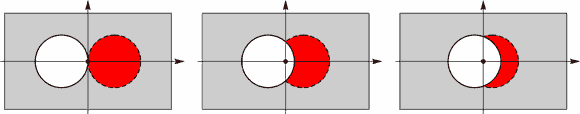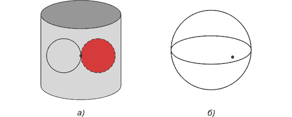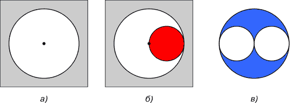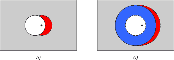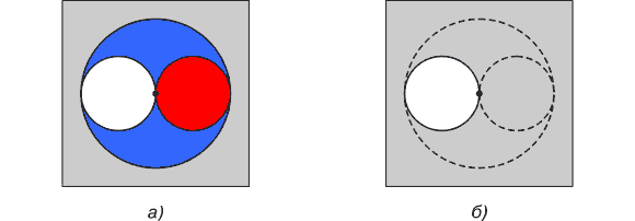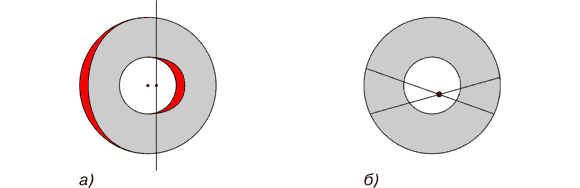 Рис. 10. Тождественное расположение масс: а) симметричное, б) асимметричное В действительности асимметрично расположенная масса имеет форму тела, выделенного красным цветом на рис. 10б. Но гораздо удобнее вычислять действие массы, имеющей форму шара (выделен на рис. 10а синим цветом), благо притяжение ими пробной массы тождественно равно. Направление действия силы во всех случаях определяется положением центра масс избыточного вещества, выделенного красным цветом. Кроме доказательства наличия сил тяготения внутри сферически-симметричной полости приведем графическую интерпретацию независимости сил тяготения от радиуса полости в случае постоянства расстояния между пробной массой и ее центром (см. рис. 11а).