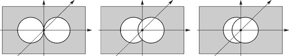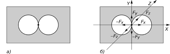 Рис. 7. Две полости в однородном изотропном пространстве Совместим начало декартовой системы координат xyz с центром пробной массы m (см. рис. 7б). Согласно начальным условиям, расположение вещества, находящегося за пределами обоих полостей, симметрично относительно начала координат. Силы тяготения, создаваемые веществом вдоль осей координат, можно описать уравнением: [Fx, Fy, Fz] = [–Fx, –Fy, –Fz]. Наличие неуравновешенных сил тяготения в произвольно выбранном направлении, не совпадающем с осями координат, предполагает несколько проекций одной силы, что нарушает условие симметрии. В случае зеркально-симметричного расположения двух полостей относительно пробного тела m, сила тяготения в начале координат отсутствует при любом другом положении двух полостей (см. рис. 8).