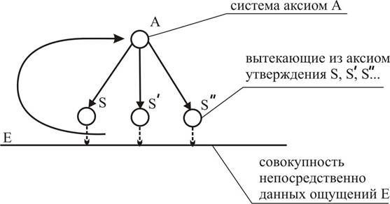 Рис.1. Схематическое представление Эйнштейном процесса познания В письме к М. Соловину от 7 мая 1952 г. он писал [1, с. 570]: 1) Нам даны Е – непосредственные данные нашего чувственного опыта. 2) А- это аксиомы, из которых мы выводим заключения. Психологически А основаны на Е, но никакого логического пути, ведущего от Е к А не существует. Существует лишь интуитивная (психологическая) связь, которая всегда может быть изменена. 3) Из аксиом А логически выводятся частные утверждения S, которые могут претендовать на то, чтобы быть правильными. 4) S сопоставляются с Е (проверка опытом). Эта процедура, строго говоря, также относится к внелогической (интуитивной) сфере, ибо отношение понятий, содержащихся в S, к непосредственным данным чувственного опыта Е по своей природе не является логическим. Но это отношение между S и Е (с прагматической точки зрения) гораздо менее надежно, чем отношение А к Е (пример: понятие “собака” и соответствующие ему данные чувственного опыта Е). Если бы подобные соответствия нельзя было устанавливать с высокой степенью надежности (хотя сделать это логическим путем нельзя), то весь аппарат логики не имел бы никакой ценнсти для”постижения действительности“ (пример–теология ). Квинтессенцией всего этого является вечно сомнительная взаимосвязь всего мыслимого с ощущаемым (чувственно воспринимаемым). В этом рассуждении не только четко указаны внелогические, подлинно интуитивные элементы, но даже оценена относительная надежность интуиции при обобщающем опыт выводе аксиоматического базиса А, с одной стороны, при проверке теории данными опыта Е – с другой. Стоит подчеркнуть одну замечательную деталь: по мере сопоставления выводов S с опытом Е аксиоматический базис должен все время проверяться и исправляться, совершенствоваться. Это, в частности, выражено на рисунке тем, что Е представленно не двумя точками – в начале и в конце, а бесконечной прямой, в разные точки которой устремлены теоретические выводы S, S, …, и из всех этих точек исходит искривленная стрелка, указывающая на необходимость сверяться с аксиоматическим базисом и в случае необходимости иправлять его. Поэтому связи опытно-чувственного и логического, как и связи аксиоматически-интуитивного с логически-дедуктивным, не являются простыми линейными цепями типа аксиома-дедуции. Они гораздо более сложны и включают многообразные обратные связи. Таким образом, в “точных” науках в процессе познания внелогический элемент выступает прежде всего в процессе выбора исходных аксиом и определений, а истинность или ложность положений, исходных для логического построения может быть установлена лишь способами, отличными от методов формальной логики – сравнением с опытом. Но тут мы сталкиваемся с важной проблемой: опыт всегда ограничен. Откуда мы знаем, что на основе ограниченного опыта мы придем к неограниченно верному выводу? Ньютон, говорит легенда, открыл закон всемирного тяготения, наблюая падение яблока. Предположим, что он наблюдал и изучал количественно это падение, чтобы прийти к достоверному заключению, даже не один, а тысячу, миллион раз, а затем на основе этих наблюдений сформулировал закон тяготения. Откуда можно черпать уверенность, что в миллион первый раз яблоко упадет в соответствии с этим же законом? Неоткуда взяться такой уверенности, кроме как из н