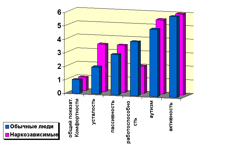 Не смотря на то, что статистически значимых различий по коэффициенту ранговой корреляции Спирмена не обнаружено, усреднённые данные, представленные в таблицах № 1-6, говорят о том, что имеются явные тенденции к изменению показателей жизнедеятельности, характеристик личности и функциональных механизмов между наркозависимыми и не употребляющими наркотические вещества людьми. Судя по всему, мы выбрали не совсем адекватный метод оценки статистически значимых различий. Коэффициент ранговой корреляции Спирмена вряд ли смог оказаться демонстративным при данной выборке испытуемых. Предварительная выборочная проверка данных по U критерию Мана - Уитни свидетельствует о том, что значимые различия существуют почти по всем показателям. К сожалению, недостаток времени не позволил нам осуществить статистический анализ в полной мере. Это будет нашей задачей на ближайшее будущее.
