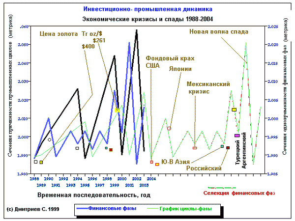 Рис.1. Макропрогноз " Прошлое-Настоящее- Будущее" на 15-летнем интервале общественно-необходимого времени формации. Для наглядности сделана селекция финансовых фаз ( сдвиг на 15 лет от 2004 г. ) 2. Интервал необходимого времени: Прошлое - Настоящее - Будущее Современная экономическая теория вступила в новейшую фазу своего развития [ 3]. Усложнение и глобализация экономических процессов выдвигает на передний план анализ темпоральных связей в единой "методологически универсальной комплексной системе", как обобщение закона стоимости, с топологически разделенными компонентами ПВ- многообразия [4 ]. В этом случае темпоральные связи выделенной временной компоненты и перенос стоимости в ПВ- интервале неопределенности точек-событий доходности в сферах обращения (инверсии) активов универсальной экономической формы сосредоточены в фазовых ячейках, несводимых к материальной точке. Тем самым фазовой ячейке в таком определении придается информационный характер с включением процессов "самоизмерений" перераспределения стоимости. Поскольку общественно-необходимое время содержит некоторое множество моментов времени UTC, то существенными являются лишь моменты переноса (перераспределения) стоимости, т.к. от этого зависит эволюция системы по относительному экономическому времени. Исключительная сложность этих процессов проявляется в комплексном отображении "финитных причинных" подмножеств в бесконечномерном множестве на "нити" суперпричинности в пространстве Минковского как одномерное число равномерных конечномерных метризаций ПВ-многообразия. В содержательном смысле это "интервал" времени возврата активов на рынках или "фазовый портрет", который содержит множество причинных траекторий порядка нескольких миллиардов точек (информационных переходов) в двумерном параметрическом фазовом пространстве. "Траектории" этих комплекных отображений фрактальной структуры выглядят как прямые линии с резкими изломами в псевдоевклидовом пространстве, что указывает на нелинейность процессов. Счетное конечномерное отображение подмножества неразличимых причинных интервалов "относительного времени" в бесконечномерном множестве суперпричинности наделяет "тяготением" ту область и в том временном интервале переноса стоимости, среди их множества, где норма эффективности инвестиций больше. Иначе, темп деградации производственных мощностей (и декапитализация), скорость обращения активов в системе, имеют глубокую внутреннюю взаимосвязь с фактором существующей квазипараллельности временного порядка UTC на мирохозяйственных рынках. Необратимость в каждой из "нитей" суперпричинности пространстве Минковского оказывается связанной с необратимостью взаимодействия с нелокальным информационным окружением относительного времени.