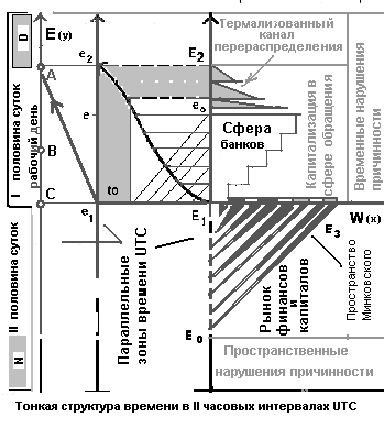 Рис.2. Тонкая структура параметрического ПВ многообразия в условиях комплиментарности хаоса и упорядоченности причинных подмножеств {UTC}. {UTC}:{f(E(y));f(W(x))} многообразия универсальной экономической формы (экономии рабочего времени) в параллельных временных зонах UTC. W(x), E(y) - параметрическая система координат ликвидность v доходность многообразия, E1, e2, e1, A - суперпричинные связи в системе W(x), E(y). E2, e2, - параллельные часовые зоны UTC (степени свободы фазового пространства ). D, N - секторы нарушения причинности в половинах суток UTC. Сфера банков - динамика ускорений доходности локальных ликвидных рынков, институтов чувствительных к малым возмущениям рынка. E0 , E1, E3 - глобальные рынки финансов и капиталов непрерывного ценообразования в пространстве Минковского. Термализованный канал e1, A - направления переноса (отображение) особенностей одной системы (метрики) в другой (метрике) в процессах капитализации стоимости на локальном уровне, (цикл 1- 3 года) экономического времени. Рабочий день - подмножество на отрезке продолжительность необходимого рабочего времени множества общественно-необходимого времени. [C;A] - временные шкалы экономии рабочего времени для параллельных секторов времени UTC. 3. Характер неопределенности макропрогноза "прошлое-будущее" Дискретный характер экономической статистики и связанная с этим дискретность формы экономических моделей находятся в противоречии с непрерывным Lвечным¦ характером движения экономической формы. Для преодоления этого противоречия в экономическом анализе вводится сложная система запаздываний или лагов. Наличие несинхронности между отдельными экономическими явлениями - это вполне закономерное явление. Однако постулирование стабильности сложной системы лагов даже в среднесрочном периоде прогноза приводит к значительным ошибкам и неточностям. Развитие средств информации и коммуникации, активное использование их в различных экономических процессах объективно ведет к сокращению продолжительности лагов и увеличению дискретности в информации, нарушениям причинности в "настоящем" [ 5] . Кроме того, внутри лагов существуют свои циклические колебания распределения, например в период подъема повышается роль текущей прибыли, как фактора инвестирования, роль прибылей прошлых лет понижается. Подобным образом связаны и многие другие экономические факторы и формы в бизнес - цикле. Особенное значение приобретает проблема оценивания ошибок при прогнозах и анализах экономического цикла в макроэкономических моделях как единой системы. Не менее сложными является и вопросы причинно-следственной интерпретации полученных математических результатов, количества в модели эндо - и экзогенных переменных [2]. Значительные препятствия при работе с макромоделями возникают и из-за математической сложности решения больших нелинейных систем. Это так называемые "взрывные тенденции" в движении систем, вызванные экспоненциальным "разбеганием траекторий" движения сложной системы при экстраполяциях на настоящее-будущее. Исключительная важность взаимосвязей государства и экономики через движение инвестиционного процесса, ценообразования, внешней торговли, динамика прибылей и занятости, госбюджета, элиминируется запаздыванием и корректировками официальной экономической статистики, что значительно сни