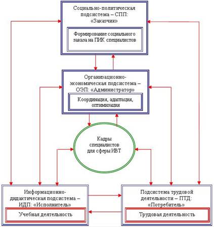 Рис.2 Органиграмма социально-политической подсистемы: подсистема "Заказчик". Б-1-1. Системно-комплексный анализ (СК-анализ) направлений подготовки и использования кадров специалистов по ИВТ в рамках сферы деятельности, предметных областей деятельности, а также совокупностей объемов научно-теоретической (НТД) и предметно-практической (трудовой) деятельности (ППД). Б-1-2. Определение целей и задач ПИК специалистов для сферы ИВТ и их представление в форме социального заказа на специалистов (СЗС), т.е. первичных директивных документов, содержание которых включает исходные данные для построения модели кадровой ситуации (МКС) в сфере ИВТ на определенный временной период. Б-1-3. Установление и закрепление на основе социальных и политических факторов юридического факта наличия потребности государства в целом, а также отраслей, регионов и т.п. в кадрах специалистов для сферы ИВТ. Иными словами, юридическая (законодательная) постановка задачи формирования социального заказа на подготовку и использование кадров специалистов для сферы ИВТ. Б-1-4. Построение модели кадровой ситуации, отражающей принципы, методы, способы, алгоритмы и параметры реализации социального заказа на подготовку и использование кадров специалистов с учетом результатов СК-анализа сферы ИВТ. Б-1-5. Формирование плана процесса ПИК специалистов для сферы ИВТ в соответствии с моделью кадровой ситуации. Б-1-6, Б-1-7. Анализ и оценка адекватности плана ПИК специалистов по критериям качества и эффективности на основе интегральных (комплексных) показателей, формируемых по данным СК-анализа ИВТ как сферы, комплекса предметных областей и соответствующих совокупностей объектов деятельности специалистов. Б-1-8. Оптимизация или рационализация плана ПИК посредством интерактивных корректирующих процедур по комплексным показателям качества и эффективности в случае неадекватности (или несоответствия) плана ПИК исходным целям, задачам, качественным или количественным характеристикам. Б-1-9. Утверждение (стабилизация) плана ПИК и санкционирование его исполнения (в случае адекватности) посредством юридического закрепления в форме законов, постановлений, приказов, распоряжений, договоров, соглашений и т.п. компетентными законодательными, директивными или административными органами государственной власти. Таким образом, перечисленные и сформулированные выше задачи по проблеме ПИК специалистов в сфере ИВТ отражают целенаправленный процесс государственного управления в рассматриваемой проблемной области, дающий возможность на основе концентрации комплексных ресурсов в оптимальных режимах решать актуальные проблемы. Информационно-дидактическая подсистема Вторая подсистема в системе ПИК специалистов для сферы ИВТ реализует необходимые виды и формы образовательной деятельности. Рассматриваемую подсистему определим с точки зрения проистекающих в ней базовых процессов как информационно-дидактическую (ИДП) (см. рис. 1). Основное функциональное назначение данной подсистемы – образовательная деятельность, т.е. формирование у обучаемых необходимых для целенаправленной устойчивой профессиональной деятельности знаний, умений и навыков. Иными словами, назначение подсистемы – подготовка высококвалифицированных кадров специалистов по информатике и вычислительной технике. 
