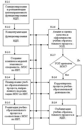 Рис.3 Органиграмма информационно-дидактической подсистемы: подсистема "Исполнитель" Б-2-1. Первый этап, реализуемый моделью, это санкционирование и регламентация целенаправленного функционирования ИДП. План ПИК поступает из СПП в ИДП с указанием сроков его осуществления, а также предоставляемых комплексных ресурсов, необходимых и достаточных для реализации плана в установленные сроки. По своей функциональной сути план выступает директивным “запускающим сигналом” – стимулом, посредством которого ИДП приводится в целенаправленное движение, осуществляющее реализацию потребностей общества и государства именно в тех кадрах специалистов и в таком количестве, которое необходимо (в рассматриваемом случае) для сферы ИВТ в требуемые сроки и при заданном качестве. Блок реализует перечисленные на первом этапе функции и задачи в логической макромодели. Б-2-2. Второй этап, представленный в модели этим блоком, связан с созданием концептуальных основ реализации ПИК в рамках ИДП. Концепция функционирования ИДП должна включать: сформулированные цели, принципы, методы, а также задачи и алгоритмы их реализации, описание необходимых ресурсов для выполнения рассматриваемых планов ПИК. Б-2-3. Третий этап отражает процессы создания комплекса моделей эталонных специалистов (МЭС). Такой комплекс должен быть ориентирован на сферу, предметные области и объекты деятельности специалиста по ИВТ. Следовательно, рассматриваемый комплекс МЭС должен иметь трехуровневую иерархическую структуру. Следует отметить, что современный подход к данному вопросу официальных методических структур Минобразования РФ, в определенной мере отражает изложенную концепцию через Государственный образовательный стандарт, а также ряд других методических документов [Концептуальный анализ…, 2001; Наукоёмкие образовательные технологии инженерных ВУЗов, 2001]. Рассматриваемый этап представлен на схеме рис. 3. Б-2-4. Четвертый этап направлен на разработку и создание моделей планирования учебно-образовательного (дидактического) процесса (УОП), дающих возможность формировать знания, умения и навыки у обучаемых в соответствии с моделями эталонных специалистов (МЭС), создаваемых на основе принципа целенаправленной деятельности. Б-2-5. Пятый этап, представленный соответствующим блоком модели ИДП, отражает возможные варианты реализации технологий и соответствующих им процессов учебной деятельности. По своей сути данный этап ориентирован на практическую реализацию образовательных технологий в рамках ИДП. На этом этапе осуществляется учебно-образовательный процесс, т.е. формируются знания, умения и навыки у обучаемых – будущих специалистов на необходимом дидактическом уровне в заданном объеме при соответствующем практическим потребностям качестве и эффективности учебного процесса. Б-2-6. Шестой этап направлен на решение задач анализа качества и эффективности сформированных у обучаемых знаний, умений и навыков, а также учебно-образовательного процесса, осуществляемого в рамках ИДП в целом, на основе дидактических и социально-политических критериев, показателей качества и эффективности. Б-2-7. Седьмой этап направлен на реализацию функции оценивания результатов учебно-образовательной деятельности ИДП. Оценивание должно, прежде всего, производится с точки зрения возм