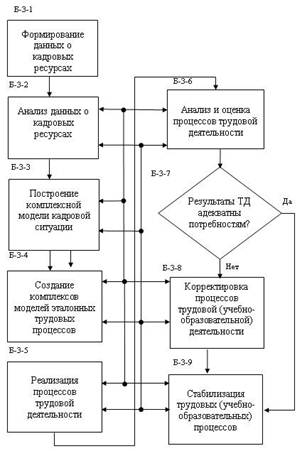 Рис. 4 Органиграмма трудовой деятельности: подсистема "Потребитель". Б-3-1. Формирование данных о кадровых ресурсах для сферы ИВТ на основе анализа и описания процессов кадрового обеспечения и сопровождения всего жизненного цикла актуализированных поколений для классов и типов технических систем в сфере ИВТ на определённые временные периоды. Б-3-2. Анализ данных о кадровых ресурсах, полученных на предшествующем этапе и, на основе полученных результатов анализа, определение и аттестация рабочих мест специалистов по всему спектру вакансий кадровых ресурсов на актуализированные временные интервалы. Б-3-3. Построение комплексной модели кадровой ситуации (МКС) для сферы ИВТ и идентификация МКС по качественным и количественным показателям (параметрам) с целью определения требований (паспорта специальности) к подготовке специалистов для сферы ИВТ. Б-3-4. Создание комплексов моделей эталонных процессов трудовой деятельности (МЭД), определяющих характер, уровень, логику, объём, темп, время и конечный результат трудовой деятельности специалиста по каждой конкретной специальности на каждом конкретном рабочем месте (степень конкретизации модели определяется, безусловно, характером деятельности). Б-3-5. Реализация процессов трудовой деятельности в соответствии с МЭД в рамках объектов (предметов) трудовой деятельности, их совокупностей, предметных областей, а также ИВТ в целом как сферы ТД специалистов. Б-3-6. Анализ результатов ТД по критериям качества и эффективности на основе соответствующих показателей, разработанных для сферы, предметных областей и объектов (предметов) деятельности применительно к сфере ИВТ. В рамках данного плана возможна корректировка МЭД в соответствии с новыми знаниями, технологиями, инструментальными средствами (орудиями труда), а также приобретённым и накопленным опытом. Б-3-7. Оценка результатов трудовой деятельности в «малом» (для конкретных ситуаций) и в «большом» (для ПТД в целом) на основе частных и интегральных показателей качества и эффективности. Б-3-8. Модернизация (рационализация, оптимизация) процессов трудовой деятельности специалистов в сфере ИВТ посредством итеративных корректировок (например, реорганизации) непосредственно процессов трудовой деятельности, а также методик анализа, критериев и показателей качества и эффективности с точки зрения человеческого фактора – адекватности специалистов выполняемым трудовым процессам, его функциональным обязанностям. Б-3-9. Стабилизация каждого из этапов, рассматриваемых выше и входящих в ПТД, а также подсистемы ТД в целом, в случае адекватности специалистов возлагаемым на них в соответствии с трудовым процессом функциональными обязанностями, приводит к стабилизации на определённом временном интервале и образовательной деятельности, осуществляемой в рамках ИДП. Блок реализует указанную функцию стабилизации (см. рис. 4). Таким образом, совокупность выделенных и рассмотренных выше девяти макроэтапов, составляющих подсистему трудовой деятельности – ПТД, и функционирующих во взаимосвязи и взаимодействии друг с другом, приводят к локально замкнутой адаптивной системе управления, представленной в форме органиграммы на рис. 4. Отметим, что в рамках системы ПИК специалистов компонент ПТД посредством внешних связей взаимодействует, с одной сторон