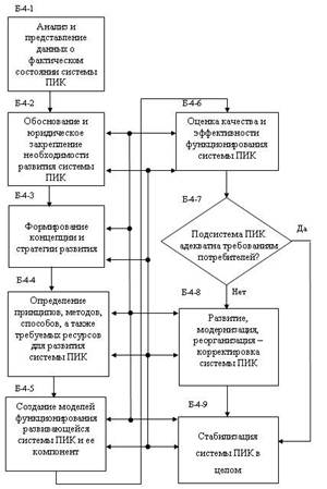 Рис. 5 Органиграмма организационно-экономической подсистемы: подсистема «Администратор». Б-4-1. Установление, обоснование и юридическое закрепление факта необходимости и целесообразности развития (модернизации, реорганизации) системы ПИК специалистов для сферы ИВТ. Б-4-2. Определение принципов, методов, способов и алгоритмов развития системы ПИК специалистов для сферы ИВТ. Б-4-3. Формирование стратегий функционирования целостной системы ПИК специалистов в сфере ИВТ для различных (внешних и внутренних) условий и ситуаций. Б-4-4. Разработка и реализация моделей функционирования целостной системы ПИК для различных условий и ситуаций. Б-4-5. Анализ и представление данных о фактическом состоянии целостной системы ПИК специалистов. Б-4-6. Оценка качества и эффективности функционирования целостной системы ПИК специалистов. Б-4-7. Принятие решения по результатам функционирования системы ПИК специалистов. Б-4-8. Развитие – модернизация, реорганизация подсистем и системы ПИК в целом через соответствующие локальные компоненты на основе взаимодействий как «сверху-вниз» – директивно, так и «снизу-вверх» – инициативно. Б-4-9. Стабилизация процессов функционирования подсистем и системы ПИК в целом через соответствующие локальные компоненты функциональных подсистем: СПП, ИДП, ПТД на основе системных данных в случае адекватности функционирования всей системы исходным целям и задачам. Таким образом, совместное действие всех компонентов ОЭП, функции которых перечислены выше, дают возможность сформировать управляющую подсистему в системе ПИК и реализовать в ней основные принципы, методы, способы и алгоритмы управления для различных стратегий развития всей системы ПИК в целом (см. рис. 1). В рассматриваемой модели системы ПИК помимо четырёх представленных выше подсистем, существует ещё одна – пятая (см. рис. 1). Эту подсистему определим как «кадровые ресурсы». По своей функциональной роли и назначению подсистема кадровых ресурсов – ПКР является центральной и интегрирующей во всей системе ПИК специалистов. Компонент ПКР описывается и представляется комплексом статических и динамических показателей, совокупности которых отражают качественные и количественные характеристики кадровой ситуации для определённых временных срезов. Определённые совокупности и группы показателей выступают в качестве общих как для ПКР, так и для других подсистем системы ПИК при организации функционирования последних. Отметим также, что эти показатели могут использоваться в целях управления при функционировании ОЭП. С учётом приведённых замечаний полная логическая схема модели системы ПИК специалистов, включающая все рассмотренные подсистемы, представлена на рис. 6.