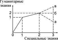 Рис. 1-а представляет достаточно образованного, но плохо обученного специалиста. Такой человек опасен для общества своей некомпетентностью и непрофессионализмом; он является источником всевозможных аварий и катастроф на производстве и транспорте. Надо сказать, что вариант 1-а встречается редко, так как по-настоящему образованный человек не потерпит собственного непрофессионализма. На рис. 1-в представлен технократ, то есть хорошо обученный, плохо образованный человек. Его кругозор узок, мышление однонаправлено; его нравственная ответственность за свои действия зачастую ослаблена; просто по-человечески он мало интересен для других как личность за пределами своей работы. Такой человек становится опасным для общества, будучи честолюбивым, пробивается в руководители. Недостаток образованости быстро проявляется в грубейших ошибках, отзывающихся на судьбах тысяч, а то и миллионов людей. Можно сказать, чем выше должность, тем более отрицательным последствиям приводит дефицит образованности у занимающего её человека. Наконец, на рис. 1-б представлен специалист, который примерно в равной степени уделяет внимание, как росту своих профессиональных знаний так и своему общекультурному, гуманитарному развитию, хорошо понимая что между ними должна быть гармония, а не противоборство. Такой вариант является наиболее предпочтительным со всех точек зрения. Например, специальные исследования показали, что при равной обученности тот из специалистов, который более образован, находит более оригинальные инженерные решения, работает продуктивнее и с большей экономией времени. Кроме того, замечено, что в условиях демократического общества общественно-политическую карьеру делают чаще всего те люди, которых отличает высокий уровень образованности. Динамика образованностиНа рис. 2 представлен график, позволяющий лучше понять соотношение между специальными и гуманитарными знаниями в процессе получения человеком среднего, а затем и высшего образования. На вертикальной оси откладываются гуманитарные знания, а на горизонтальной — специальные. В средней школе рост гуманитарных знаний опережает накопление специальных, так как общеобразовательные предметы явно преобладают. В вузе ситуация меняется: рост профессиональных знаний происходит быстрыми темпами, тогда, как приращение гуманитарных знаний происходит медленнее (дисциплины этого цикла составляют 25-30% учебных планов).