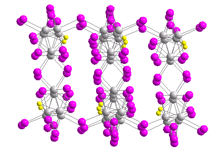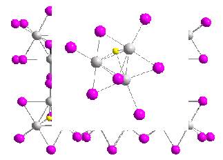 -углы: -a=90.00 -b=99.49 -c=90.00 Объём элементарной ячейки: 1489.7Å3 Плотность ячейки: 5.346 g/cm3 Число формульных единиц в ячейке: 4 Расшифровка и визуализация структуры производились посредством кристаллографической программы DIAMOND версии 2.00.(Рис. 1,2) Координация атомов. Контакты имеются между S-Nb, Nb-Nb, Nb-I. Это кластерное соединение со связностью=2. Слой состоит из двух слоёв, образованных треугольниками из атомов Nb. Они соединяются мостиковыми атомами I. Все атомы Nb равноценны, а атомы I есть двух типов(I1, I2). ( Смотри рисунки ). -К.ч. Nb: 2 Nb+4 I1 +1 I2 +1 S=8 -К.ч. I1: 2 Nb=2 -К.ч. I2: 3 Nb=3 -К.ч. S: 3 Nb=3 Атомы I1 имеют различные функции. Часть атомов связывает единичные структуры, а часть служит мостиками между 2 атомами Nb внутри единичной структуры. Длины связей(L). -Nb-Nb: 2.768, 2.776, 2.781. ∑L=2.775Å. -Nb- I1: 2.819, 2.821, 2.863, 2.919. ∑L=2.855Å. -Nb- I2: 2.819, 2.824, 2.838. ∑L=2.827Å. -Nb-S: 2.413, 2.421, 2.434. ∑L=2.422Å. Средние значения длинн связей соответствуют нормальным длинам связей между парами данных атомов. Валентные углы. -Nb-Nb: 59.74, 60.04, 60.21. -Nb- I1(связывающий слои):94.97, 127,2. -Nb- I1(внутри ед. структуры):58.99, 59.22, 59.26. -Nb-S:69.63, 69.75, 70.23. В поперечном сечении слоя полиэдры соединяются рёбрами, а в продольном сечении-вершинами. Разберём Nb3SI7 с помощью правила 18-ти электронов. 5(эл-ны Nb)+2(связь Ме-Ме)+5(эл-ны I)+6(эл-ны S)=18, следовательно структура устойчива. Но вообще правило 18-ти электронов в многоядерных кластерах не всегда применимо. Рис.1