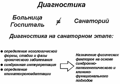 Говоря об оснащенности и комфортности здравниц, надо отметить, что они являются одним из важнейших аспектов совершенствования санаторно-курортного лечения. Это же подтверждает маркетинг рынка рекреационных услуг. (Рис.4). Решение вопроса пребывания детей с родителями в санаториях, размещение в одноместные номера тех, кто прибывает в здравницы один, значительно снизит психологическую напряженность больных и повысит эффективность санаторно-курортного лечения. Собственно лечебно-диагностический процесс в отдельных здравницах, несмотря на большую схожесть, организуется эксклюзивно, в зависимости от особенностей их размещения и оснащения, структуры лечащихся больных. В связи с этим в санаториях разрабатываются и соответствующим образом оформляются системы: приема больных; неотложной помощи; диагностики; лечения; психотерапии; санитарно-гигиенических и противоэпидемиологических мероприятий. Диагностический процесс в санаториях строится обычно как копия (неизбежно ухудшенная) больничной диагностики, нет правильного понимания клинических различий контингентов. В санатории прибывают больные, как правило, в фазах ремиссии хронических заболеваний, т.е. с малосимптомными формами. От врача-курортолога это требует гораздо большей врачебной наблюдательности и зоркости, чем от больничного коллеги. С другой стороны, задача санаторно-курортного лечения — общее оздоровление — требует не только диагностики болезни, но и оценки общего состояния реактивности и климатохроноадаптации. Основное значение имеет констатация и динамическая оценка функциональных показателей. Диагностика не ограничивается определением нозологической формы, но и требует синдромной интерпретации, поскольку назначение физических факторов осуществляется на основе синдромно-патогенетического и клинико-функционального подходов. (Рис.6) Хорошие результаты дает двухэтапная система диагностики. Использование такой системы позволяет значительно повысить выявляемость заболевания, а значит, и проводить полноценное комплексное лечение больных. (Рис.7).
