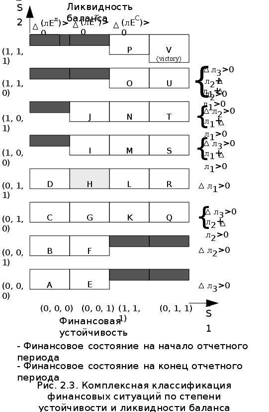 На рис. 2.3 заштрихованы квадраты, изображающие невозможные сочетания степени устойчивости и степени ликвидности. Для удобства все квадраты, имеющие экономический смысл, помечены латинскими буквами таким образом, что финансовая ситуация, имеющая абсолютную устойчивость и абсолютную ликвидность, получает обозначение V (victory - победа).