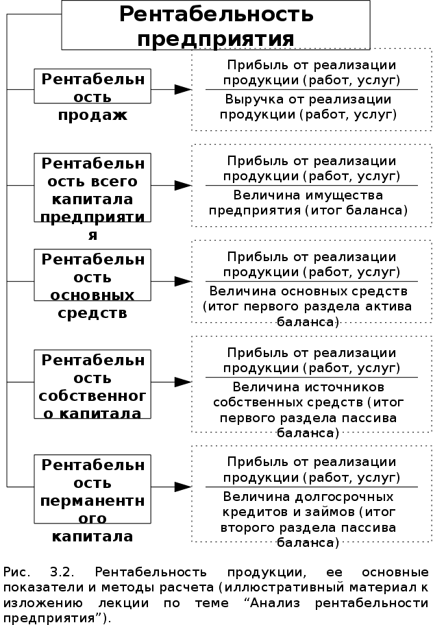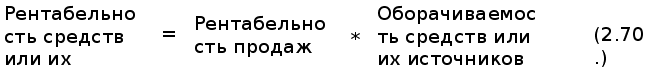 Эта формула показывает, что прибыльность средств предприятия или их источников обусловлена как ценообразовательной политикой предприятия и уровнем затрат на производство реализованной продукции (они комплексно отражаются в показателе рентабельности продаж), так и деловой активностью предприятия, измеряемой оборачиваемостью средств или их источников. Формула (2.70.) указывает пути повышения рентабельности средств или их источников (т.е. степени прибыльности использования капитала предприятия или его составных частей): при низкой прибыльности продаж необходимо стремиться к ускорению оборота капитала и его элементов и, наоборот, определяемая теми или иными причинами низкая деловая активность предприятия может быть компенсирована только снижением затрат на производство продукции или ростом цен на продукцию, т.е. повышением рентабельности продаж. Рассмотрим наиболее важные финансовые коэффициенты рентабельности и деловой активности. Коэффициенты рентабельности (R): 1R) рентабельность продаж